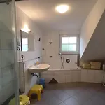Die Ferienhof Metzler überblickt den Garten. Die Villa bietet außerdem über ein private Badezimmer mit einer begehbaren Dusche, einer getrennten Toilette und einer Badewanne.